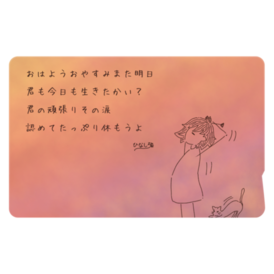 ICカードステッカー - 約85.7x53.9(mm)この商品はpixivFACTORYで作られた商品です。サンプル画像は完成イメージのため、実物と異なる場合があります。 ひなしろの詩シリーズ第二弾「息づく距離」より、第十篇のデザインのICカードステッカーです。 通学、通勤、お出かけの際にも、心安らぐひと時を持ち歩けます。