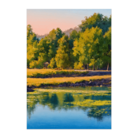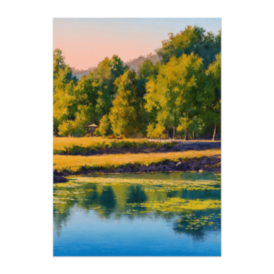 静かな湖畔の午後 ― 水彩油彩風 森と水面の風景ポスター