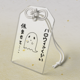 アクリルお守り - 50 × 80mm【ハロウィンくらい休ませて……】休息祈願アクリルお守り 「イベントの日くらい、何にも邪魔されずに休みたい……」 そんな全人類の切実な願いを、ゆるいおばけが代弁してくれるお守り型アクリルキーホルダーです。 ご利益:有給休暇の取得促進、残業回避、心の平穏。 デザイン:力尽きたおばけのイラスト。切実なメッセージが、あなたの「休みたい欲求」を周囲にそれとなく伝えます。 カバンやポーチに付けて、多忙な日常からの「脱出」を祈願しましょう。