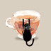 A cozy minimalist wall art illustration featuring a cute black cat hanging on a tea cup, inspired by Japanese minimal design and Japandi interior style.