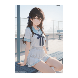 ポスター - B2この商品はpixivFACTORYで作られた商品です。サンプル画像は完成イメージのため、実物と異なる場合があります。 午後の光が差し込む屋上で、静かにベンチに腰掛ける少女を描いたイラストです。 白と淡いブルーのセーラー服が、清潔感と落ち着いた印象を与えます。 穏やかな時間を感じさせる、飾りやすい一枚です。