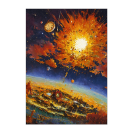 ポスター - B2この商品はpixivFACTORYで作られた商品です。サンプル画像は完成イメージのため、実物と異なる場合があります。 宇宙空間で起こる、時間と光の爆発。 水彩と油彩が激しく交錯し、 時計や惑星が飛び散るように描かれた幻想世界。 エネルギーと詩的イメージが共存する、 印象的なアートポスターです。