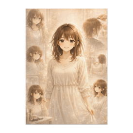 ポスター - B2この商品はpixivFACTORYで作られた商品です。サンプル画像は完成イメージのため、実物と異なる場合があります。 眼鏡の奥でうつむいていた私が、 少しずつ自分に手をかけ、 選び、向き合い、笑えるようになるまで。 このポスターは、 「変わったから価値が生まれた」のではなく、 「ちゃんと生きてきた時間すべてが今につながっている」 という想いを、一枚の物語として描いています。 派手な演出はなく、 静かでやさしい光の中で、 過去の自分も、今の自分も、 どちらも肯定できるような一枚です。 お部屋に飾ったとき、 ふとした瞬間に 「このままでいいかも」 と思える存在になれたら嬉しいです。