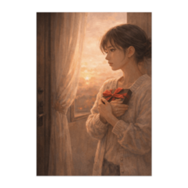 ポスター - B2この商品はpixivFACTORYで作られた商品です。サンプル画像は完成イメージのため、実物と異なる場合があります。 胸に抱いたままの贈り物と、沈みゆく夕暮れ。 踏み出す勇気と、ためらいの間にある時間を切り取った一枚です。 光と影が交差するその瞬間は、 誰の心にも残る「決めきれなかった記憶」を呼び起こします。