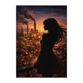 ポスター - B2この商品はpixivFACTORYで作られた商品です。サンプル画像は完成イメージのため、実物と異なる場合があります。 光り輝く工場夜景を背景にした女性シルエットの縦長ポスター。工業的な光の美しさと静かな人物シルエットの対比が印象的なアート作品です。