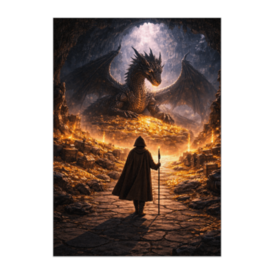 ポスター - B2この商品はpixivFACTORYで作られた商品です。サンプル画像は完成イメージのため、実物と異なる場合があります。 黄金の財宝を守るドラゴンと対峙する旅人を描いたファンタジーアートポスターです。迫力ある構図と幻想的な光が印象的で、物語性のあるインテリアアートとして楽しめます。