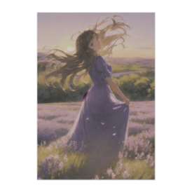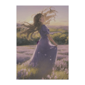 ポスター - B2この商品はpixivFACTORYで作られた商品です。サンプル画像は完成イメージのため、実物と異なる場合があります。 広がるラベンダー畑と夕陽のグラデーション。 風に揺れるドレスと光が織りなす、穏やかな時間を描いた一枚。 リラックス空間におすすめのフローラルアート。
