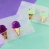ポップでかわいい、でもオトナな仕上がりのひんやりアイスのピアス/イヤリングです。 -------------------------------- 【作品について】 アイスというちょっと子供っぽいモチーフですが、コーンの部分をゴールドにして、カラーも可愛いすぎない色を選ぶことでオトナにあったアクセサリーに仕上げました。 お味は、さわやかな黄緑にシルバーのラメが光る「ミント」と、濃い目のパープルがよりオトナ感をプラスする「巨峰」の2つをご用意。 トッピングにはアクセントになるビビットなピンクのスワロと各味に合わせた小さめスワロを沿えています。 アイスのパーツはデザインもカットも自前のオリジナルです。 -------------------------------- 【着用について】 サイズは縦2㎝、横1.2㎝ほどで、場面を選ばない小ぶりな大きさになっています。 アクリルで作っているので、軽くて長時間の着用もストレスがありません。カジュアルな格好にオススメなので、近場のお買い物などちょっとしたお出かけにもさらっと着けて頂けたら^^ ポップでオトナなアイス、お一ついかがでしょうか。