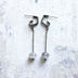 インドストリアルな雰囲気の、シンプルなピアスに グレークオーツのボタンカットをぶら下げました。 ピアス本体は丸線を叩いて甲丸線にして。 点を刻印したり、やすりで細い線をいれたりして作りました。 横からみるとGなピアスです。 下がっているグレークオーツ部分ははずせます。 下がっているチャームが落ちないように、曲げてみたら Gに。 出来上がっている物なので、 お支払い確認後2~3日中に発送いたします。 レターパックライトかネコポスで発送予定です。 950銀 ピアスキャッチ:925銀(中はシリコン) ピアス本体の幅:2㎜ グレークオーツの幅7㎜ 厚み5.5㎜ チャームの長さ:35㎜ 全体の長さ:50㎜ ピアスポストの太さ:8㎜