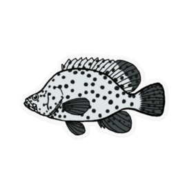 ステッカー - 100 x 100 (mm)日本近海で見られるハタの仲間たちを描いたハタスケッチから「サラサハタ」のクリアステッカーです。盛り上がった背中が特徴的な白い体に黒い斑紋の美しいお魚です! サラサハタ推しの方はぜひ!