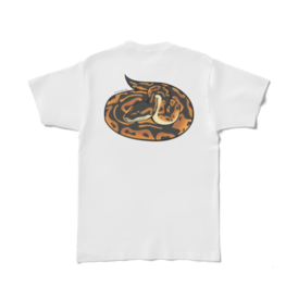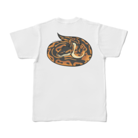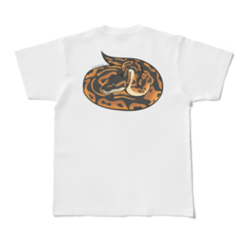 Tシャツ - XL - 白デフォルメしたボールパイソンをメインに押し出したバックプリントの白Tシャツです。 爬虫類好き、ボールパイソン好きな人はもちろん、普通のTシャツとしても着れる可愛らしいキャラデザインにしました。 この商品はpixivFACTORYで作られた商品です。サンプル画像は完成イメージです。