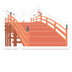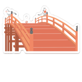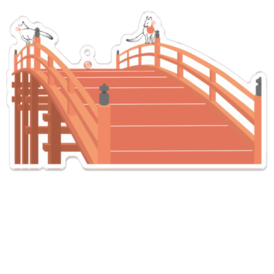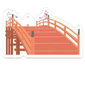 アクリルキーホルダー - 100 x 100 (mm)狐の赤太鼓橋 アクリルキーホルダー。 赤い太鼓橋の上で手毬遊びをする狛狐たち。