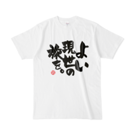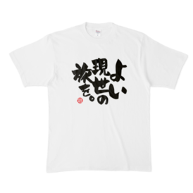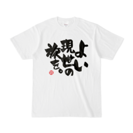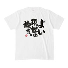 水曜なんとか風Tシャツ。白色 これを着てよい現世の旅をお楽しみください。 黒色もあります。 S,M,L,XLの4サイズ展開です。(サイズの詳細は下記の「製品仕様」からご確認ください) この商品はpixivFACTORYで作られた商品です。サンプル画像は完成イメージのため、実物と異なる場合があります。