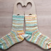 #セロデクプチ2 参加しています🧡💚 瀬出カラーの手編み靴下です。コットン混紡糸を使っているので心地良くオールシーズン履いていただけます。①と同じように見えますが甲部分に筋模様が入っています。 甲&足裏、足首には2種類の糸(オレンジ系段染め×グリーン系段染め)を1段ずつ編んでいるので瀬呂くんとデクくんはいつでも一緒です。爪先、踵、履き口は左右色違いにしているので、足👣を揃えたり正座したりした時、二人が並んでくれます(画像参照) 【サイズ】 23cm~25cmくらい 【糸情報】 コットン72% ポリアミド(ナイロン)18% ポリエステル10% 【洗濯方法】 ・手洗いが推奨されていますが、私は40℃以下の水温で洗濯ネットに入れて普通の洗剤(液体)を使い洗濯機で洗っています。 ・柔軟剤・漂白剤はおすすめされていません。使う際は個人の責任でお願いします。 ・乾燥機は不可 ・アイロンは110度以下