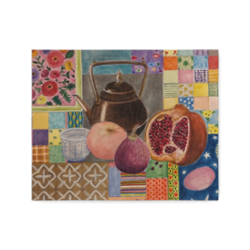 食器、フルーツ、バックにはパッチワークのような絵柄を水彩絵の具でヴィンテージ感を表現した作品を、キャンバスにプリントしました。(原画ではありませんが、原画のような質感で表現されています。) サイズはF3号(273mm×220mm)になります。 この商品はpixivFACTORYで作られた商品です。サンプル画像は完成イメージのため、実物と異なる場合があります。