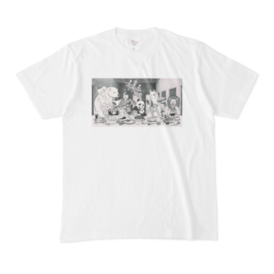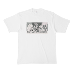 動物たちが『最後の晩餐』風にランチやスイーツを楽しんでいるイラスト『みんなのお気に入り』のTシャツです。 S:身丈66cm 肩幅44cm 身幅49cm M:身丈70cm、肩幅47cm、身幅52cm L:身丈74cm、肩幅50cm、身幅55cm XL:身丈78cm 肩幅53cm 身幅58cm
