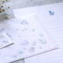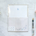 moment. LetterSet 鉱石の一瞬の煌めきを水彩の儚い色と静かな輝きの箔で表現したレターセット。 すりガラスのような封筒に入れると、便箋裏の鉱石の模様が淡く浮かび上がります。 封筒と封緘シールはホログラムの箔押し、便箋はシルバートナーを使用した贅沢仕様です。 便箋はたっぷり書き込めるA5サイズで、書き心地が良く高級感のある紙を使用しています。 宛名シール同封。 〈セット内容〉 ・封筒 2枚 ・便箋 4枚 ・宛名シール 2枚 ・封緘シール 2枚 〈サイズ〉 封筒:洋2封筒(162×114mm) 便箋:A5(148×210mm) 宛名シール:65×90mm 封緘シール:15×45mm オプションで試し書き用紙の同梱を承っております。 試し書き用紙は210×99mmサイズで、便箋と同じ紙を使用しています。 ペンやインクと便箋の相性を確かめる際にご利用ください。 (制作時期や保存状態が異なるため、完璧な書き心地の再現を保証するものではございません。ご了承ください。) 試し書き用紙をご希望の方は、ご注文時にメッセージでその旨をお伝えください。 本品の発送完了後は受け付けておりません。お手数ですが試し書き用紙のみご注文ください。