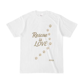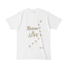優しい風合いの墨絵タッチで描かれた、2匹のゴールデンレトリバーと足跡が印象的なTシャツです。 背面には並んで歩く犬たちの後ろ姿と足跡、前面には「Rescue is LOVE」のメッセージが柔らかなセピア色で配置されています。 白Tシャツに馴染む繊細なトーンで、主張しすぎず普段使いしやすいデザイン。 犬好きさんや保護犬活動に共感する方へのプレゼントにもおすすめです。 【MIRA DOGについて】 保護犬の支援活動を目的としたオリジナルブランド「MIRA DOG(ミラドッグ)」より。 売上の一部は保護活動・保護犬のための物資に活用されます。