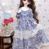 ブルーのリバティプリント生地を使用したロングドレスとミニリボンクリップのセットです。 ハイウエスト切替でゆったりとしたシルエットに仕上げました。 胸元にはスパンコールやビーズで装飾し、ウエストにはオーガーンジーのリボンを飾りました。スカート部分のレース生地や銀糸のピンタックが涼しげな印象です。 リボンクリップは裏にパッチンどめがついています。 ※背面のスナップボタンの位置を変更した影響で、スナップを縫い付けていた跡が残っています。着用時には隠れる位置ですが、ご了承ください。 モデル:SD女の子分割ボディ SD女の子、SD13女の子、SDGr女の子が着用できます。 クリア袋に入れた簡易包装で、ネコポスでのお届けです。