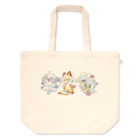 レイメイ、ユウグレ、マツヨイの3匹がおさんぽしてるトートバッグだよ! おっきいサイズだから色んなもの入れて一緒にお散歩しよう!