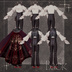 ⇩インナー⇩ フリルシャツ 付け襟 ⇩アウター⇩ フリルタイ ジャケットベスト コルセット ⇩ズボン⇩ 腰のフリル ズボン ⇩マント⇩ 肩の羽 大翼のマント ⇩靴⇩ 靴下(おまけ程度です!) ブラッドシューズ ⇩アクセ⇩ ヴァンパイアイヤーのイヤーカフ