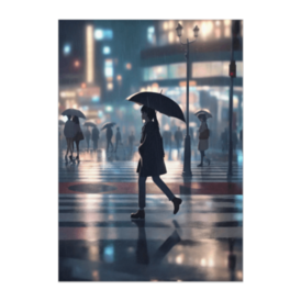 この商品はpixivFACTORYで作られた商品です。サンプル画像は完成イメージのため、実物と異なる場合があります。 雨の中、静かに横断歩道を渡る人々。濡れた路面に反射する街の光が、夜の静けさと孤独を際立たせます。都会の雨夜をテーマにした、切なさと美しさが同居する一枚です。