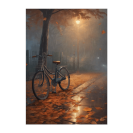 この商品はpixivFACTORYで作られた商品です。サンプル画像は完成イメージのため、実物と異なる場合があります。 オレンジの街灯に照らされた落ち葉と自転車。雨に濡れた路面が秋の夜を美しく映し出します。温もりと切なさが同居する季節のポスター。