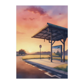 この商品はpixivFACTORYで作られた商品です。サンプル画像は完成イメージのため、実物と異なる場合があります。 茜色の空に包まれた小さなバス停。誰かを待つような静けさと、終わりゆく一日のあたたかさが共存する情景です。日常の中にある美しい瞬間を切り取った一枚。