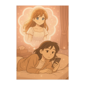 この商品はpixivFACTORYで作られた商品です。サンプル画像は完成イメージのため、実物と異なる場合があります。 いつもの部屋、いつものスマホ。 でも、ふとした瞬間に始まる “妄想モード”。 吹き出しの中には、理想化された自分が微笑む――。 現実と夢の境界が溶けていく、笑えて少し切ない1枚です。 シリーズ「妄想デート ― 現実と脳内のあいだで」より。 くすんだ日常トーンと少女漫画的な光の対比をお楽しみください。