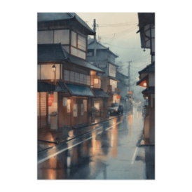 この商品はpixivFACTORYで作られた商品です。サンプル画像は完成イメージのため、実物と異なる場合があります。 雨上がりの石畳に灯りが映える、しっとりとした町の一角。 提灯と家々の温もりが、都会の静けさを包み込む。 雨音が聞こえるような一枚です。