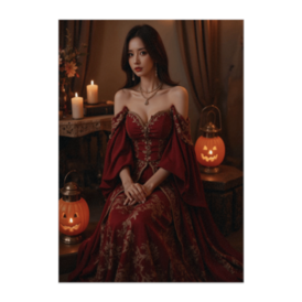 ポスター - B2この商品はpixivFACTORYで作られた商品です。サンプル画像は完成イメージのため、実物と異なる場合があります。 ビクトリア風ドレスに身を包んだ美女が、パンプキンランタンの灯りに囲まれて微笑む。クラシカルで温かみのあるハロウィンナイトを描いた一枚です。
