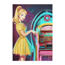 ポスター - B2この商品はpixivFACTORYで作られた商品です。サンプル画像は完成イメージのため、実物と異なる場合があります。 金髪ポニーテールの女の子が花のように輝くジュークボックスの前に立つ。ロックンロールの鼓動が聞こえてくる、明るく華やかな一枚。