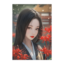 ポスター - B2この商品はpixivFACTORYで作られた商品です。サンプル画像は完成イメージのため、実物と異なる場合があります。 赤い彼岸花の中で、静かに微笑む女性。 光と影のバランスが幻想的な印象を与えます。 情熱と静寂が共存するアートポスター。