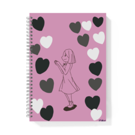 リングノート - B5 - 両面この商品はpixivFACTORYで作られた商品です。サンプル画像は完成イメージのため、実物と異なる場合があります。 ふと、浮かんだアイデアからハートの中に女の子が掴もうとしているイラストです。 落ち着いたピンクが優しい印象です
