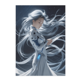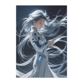 ポスター - B2この商品はpixivFACTORYで作られた商品です。サンプル画像は完成イメージのため、実物と異なる場合があります。 流れるような銀髪と静かな夜風。 白いスーツに青い光が宿り、 人と機械の境界を越えて“想い”が漂う。