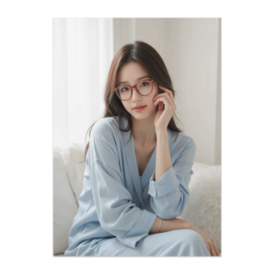 ポスター - B2この商品はpixivFACTORYで作られた商品です。サンプル画像は完成イメージのため、実物と異なる場合があります。 やわらかな白い光の中で微笑む女性。 水色の部屋着と赤ぶち眼鏡の組み合わせが、知的で上品な印象を与えます。 清潔感とやさしさを感じるアートポスターです。