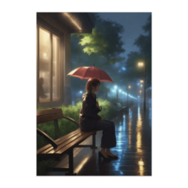 ポスター - B2この商品はpixivFACTORYで作られた商品です。サンプル画像は完成イメージのため、実物と異なる場合があります。 深夜の公園、しとしと降る雨の中で赤い傘を差して座る女性。 街灯の柔らかな光と濡れた遊歩道が、静けさと温もりを感じさせます。 ゆるやかな時間が流れる、心落ち着くポスター作品です。