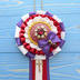 アイカツ!の、スノープリンセスコーデをイメージしたロゼットです。 ロマンスストーリーの白雪姫がテーマのドレスに相応しく、ゴージャスでエレガントな衣装。 紫と白のスカートは、2色のリボンを交互に縫い合わせました。 金のブレードとタッセルは金の紐で表現しています。中央にスワロフスキーを配置し、豪華なデザインにしました。背中にリンゴを背負っているので、リボンの下にリンゴもプラスしました。 大きさは約14cm、ボールチェーンでバッグチャームのようにぶら下げてお使いいただく形です。 裏面にブローチピンは付いていません。 バーツの接着にグルーガンを使用しています。 夏の車内に放置しないようお願いいたします。 1点1点アイカツへの愛と心を込めて手作りしています。