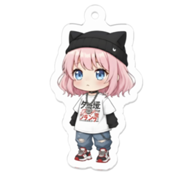 アクリルキーホルダー - 50 x 50 (mm)ピンクの髪と澄んだ瞳が印象的。クールな猫耳ニット帽に、だぼっとTシャツとダメージデニムで、ストリートスタイルもばっちりキマってる!一見クールだけど、どこか守ってあげたくなる表情がたまらない。ストリートファッション好きにはたまらない、彼女の魅力が詰まったグッズだよ! この商品はpixivFACTORYで作られた商品です。サンプル画像は完成イメージのため、実物と異なる場合があります。