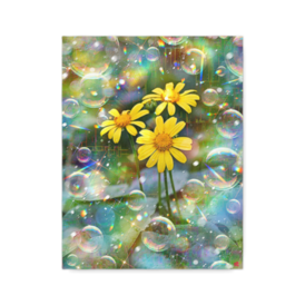 キャンバス - F6詩:陽だまりに咲く微笑み Light of Blessing 冬麗の 陽だまりに 小さき黄金の花は 子らと夢を語る 家族の庭に舞うシャボンは 子らの願いを運び 家族の祈りが 静謐の空に溶けて行く 陽だまりに咲く微笑み Light of Blessing ‐戎‐ Poetry. ”Light of Blessing” Winter's tender grace in the sunlit space. The small flower listens to their bright, hopeful words. Bubbles dance, carrying their quiet wish. The family's silent prayer dissolves in the quiet sky. A smile blooming in the sun, Light of Blessing. -Kai- God bless you. 趣旨ーーーーーーーーーーーーーーーーーーーー ## 作品制作趣旨 作者は、初冬の朝の庭で、自分の娘達が楽しそうに談笑しながら庭に咲く鮮やかな黄色のツワブキ(Bright yellow Leopard plant flowers)を愛で、遊んでいる様子を思い出し描きました。 作者は、自分の娘たちが成長して行く様や、娘たちが希望に満ち溢れた笑顔で遊ぶ光景を、陽の光や虹色のプリズムで表現しています。 ## 絵画「陽だまりに咲く微笑み Light of Blessing」の解説 **1. 全体的な印象** このデジタル絵画は、光と色彩が溢れる幻想的な世界観を持っています。初冬の庭という具体的な情景を背景に持ちながらも、具象的な描写よりも、希望や無邪気さといった抽象的な感情を表現することに重点が置かれています。画面全体に散りばめられた虹色の光とシャボン玉が、見る者に温かく明るい幸福感を与えます。 **2. 色彩** 中心のツワブキの鮮やかな黄色と、背景の幻想的に滲む青緑色が鮮やかなコントラストを形成しています。黄色は希望や生命力を象徴し、周囲の青緑や虹色のプリズムは、夢や祝福、清らかさを表現しています。デジタル処理による光の反射やきらめきが多用され、絵画全体が発光しているような印象を与えます。 **3. 構図** 構図は、中央下部に黄色い花が寄り集まって咲く姿を配置し、視線を集めています。その周囲、そして画面全体を大小のシャボン玉が取り囲むという、非常に動的かつ包容力のある構図です。この動的な構図は、娘たちが楽しそうに遊んでいる様子や、希望が満ち溢れる未来への広がりを感じさせます。 **4. 技法** デジタルペインティングの特性を活かし、油彩や水彩では再現が難しい、鮮烈な光のエフェクトやテクスチャの重なりが用いられています。特に、シャボン玉の虹色の光の屈折や、背景にうっすらと見える電子的なパターンは、現実の庭の風景を超越した、幻想的な美しさを創り出しています。 **5. 表現力** この作品は、作者の娘たちへの深い愛情と、彼女たちの未来への願いを、詩的かつ力強く表現しています。初冬に咲くツワブキの力強さと、虹色のシャボン玉の儚さが対比されることで、人生の尊さや一瞬の輝きが強調されています。 **6. 美術的価値** この絵画は、写実性よりも、光や色彩を通じた感情の表現、特に希望や祝福といった普遍的なテーマを追求しています。デジタルアートの持つ新しい表現の可能性を示しながら、家庭的な温かさと宗教的な静謐さを融合させている点に美術的な価値が見出されます。 **7. 作品に込められた想い** 作者は、娘たちがツワブキを愛でる光景を、彼女たちの健やかな成長と、未来へ向けた希望の象徴として捉えています。虹色の光は、神聖な祝福や普遍的な愛を意味し、この愛しい光景が永遠に続くようにという親の切なる願いが込められています。 **8. 作品の鑑賞方法** 鑑賞者は、まずシャボン玉の虹色の美しさや、中央の黄色い花が放つ光に目を奪われるでしょう。視覚的な楽しさだけでなく、この明るい光景の中に、親から子への穏やかな祈りや、困難に負けない静かな強さといった深いメッセージを感じ取ることが、この作品の鑑賞方法となります。 **9. 作品の価値** この作品の価値は、個人的な家族の思い出を、光と色彩の力を借りて、普遍的な喜びと希望のテーマへと昇華させた点にあります。見る者自身の家族や未来に対する希望を呼び覚ます、感情的かつ精神的な価値を持っています。 ## 詩「陽だまりに咲く微笑み Light of Blessing」の解説 **1. 全体的な印象** この詩は、短く簡潔な一行詩を重ねることで、静けさの中に深い情感を湛えた現代詩の形式をとっています。初冬の庭という具体的な情景から始まり、子どもの無邪気さ、親の願い、そして最終的に普遍的な「祝福の光」へと昇華していくドラマチックな構成を持っています。全体を通して、穏やかで平和な雰囲気が流れています。 **2. 韻律** 音数律や定型詩的な厳密な韻律はありませんが、各行が短く、切れの良い口語的な表現で統一されているため、リズミカルな流れを生んでいます。特に、「陽だまりに咲く微笑み」という柔らかな響きと、「Light of Blessing」という神聖な響きが組み合わされ、最終行で強い余韻を残しています。 **3. 修辞** 擬人法や隠喩が多く用いられています。「小さき黄金の花は 子らと夢を語る」では、花に「語る」という擬人法を用いることで、子どもの遊びに詩的な深みを与えています。「家族の祈りが 静