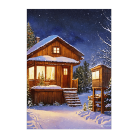 ポスター - B2この商品はpixivFACTORYで作られた商品です。サンプル画像は完成イメージのため、実物と異なる場合があります。 深い森の中にぽつんと佇む小さな家。 窓からもれるあたたかな灯りと、雪に包まれた静かな夜空が美しく響き合います。 水彩油彩風のノスタルジックな冬のワンシーンです。