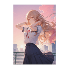ポスター - B2この商品はpixivFACTORYで作られた商品です。サンプル画像は完成イメージのため、実物と異なる場合があります。 柔らかい夕陽が差し込む屋上で、風に髪をなびかせる少女を描いたアニメ風ポスターです。金髪のロングヘアとセーラー服が光に溶け込むように輝き、青春のきらめきを美しく表現しています。穏やかな風景と柔らかな色彩が、お部屋に温かい雰囲気を添えます。