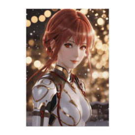 ポスター - B2この商品はpixivFACTORYで作られた商品です。サンプル画像は完成イメージのため、実物と異なる場合があります。 柔らかな赤髪をまとめたサイボーグ少女を、白とゴールドを基調とした装甲で描いた華やかな一枚。背景に揺らめく黄金色のイルミネーションと雪が、冬の温もりと幻想性を演出します。落ち着いた笑みと気品漂う佇まいが印象的な作品です。