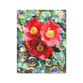 キャンバス - F6詩:初霜溶かす華の笑み Family's Unfading Hope 澄明の庭に 笑顔が輝く 光は語る 家族の夢 冬の静けさに 子らの笑い声がこだまし 団欒の庭に 希望が舞う 初霜溶かす華の笑み Family's Unfading Hope -戎- Poetry. ”Family's Unfading Hope” In the lucid garden smiles shimmer Light speaks the family's dream In winter's hush children’s laughter echoes In the gathered garden hope dances The smile that melts first frost Family's Unfading Hope -Kai- God bless you. 趣旨ーーーーーーーーーーーーーーーーーーーー ## 作品制作趣旨 作者は、初冬の朝の庭で、自分の娘達が楽しそうに談笑しながら庭に咲く明るく鮮やかな山茶花(Vibrant Camellia sasanqua flowers)を愛で、遊んでいる様子を思い出し描きました。 作者は、自分の娘たちが成長して行く様や、娘たちが希望に満ち溢れた笑顔で遊ぶ光景を、陽の光や虹色のプリズムで表現しています。 ## 絵画「初霜溶かす華の笑み Family's Unfading Hope」の解説 **1. 全体的な印象** この作品は、初冬の澄んだ空気の中で咲く花々と、幻想的な光の粒子が織りなす静謐な世界を描いています。自然の美しさと家族の温もりが調和し、穏やかな感動を呼び起こす絵画です。 **2. 色彩** 赤い花弁の鮮烈さと黄色の蕊の温かさが中心を彩り、周囲には虹色の光とシャボン玉が柔らかく広がっています。冬色の背景と緑の葉が調和し、季節の移ろいと希望の兆しを感じさせます。 **3. 構図** 花々が画面の中心に配置され、泡や光が円環状に広がることで、時間の流れと空間の広がりを暗示しています。姉妹の存在は直接描かれていませんが、構図の柔らかさと動きにその気配が宿っています。 **4. 技法** デジタル技法を用いながらも、筆致のような柔らかさが残されており、幻想性と現実感が共存しています。幾何学的な光の模様と自然の形態が融合し、静けさと生命の輝きを表現しています。 **5. 表現力** 花の咲く力強さと泡の儚さが対比され、家族の絆と子供の成長というテーマが視覚的に昇華されています。色彩と光の使い方により、感情が静かに、しかし深く伝わってきます。 **6. 美術的価値** 自然と人間の関係性を、宗教的・哲学的な視点からも捉えた作品であり、鑑賞者に内省を促す力を持っています。季節の象徴としての花と、家族の象徴としての光が融合し、普遍的な美を描いています。 **7. 作品に込められた想い** 娘たちの成長と笑顔に込められた希望が、初冬の庭に咲く花と重なり、未来への祈りとして描かれています。作者の個人的な記憶が、普遍的な愛と尊さへと昇華されています。 **8. 作品の鑑賞方法** 静かな場所で、時間をかけて光の粒子や色彩の層を感じ取るように鑑賞することで、作品に込められた感情の深さが開かれてきます。視覚だけでなく、心で受け止めることが求められます。 **9. 作品の価値** 家族愛、季節の移ろい、自然の美しさを一枚に収めた作品として、個人の記憶と普遍的な感情をつなぐ架け橋となります。宗教的な静けさと希望の光が、鑑賞者の内面に響きます。 ## 詩「初霜溶かす華の笑み Family's Unfading Hope」の解説 **1. 全体的な印象** この詩は、静けさの中に希望を宿す構成で、家族の絆と季節の移ろいを優しく描いています。短い行に込められた言葉が、余白の中で深く響き、読者の心に静かに染み入ります。 **2. 韻律** 自由詩でありながら、各段落のリズムが整っており、呼吸のような間合いが保たれています。語尾の響きが柔らかく、詩全体に穏やかな流れを生んでいます。 **3. 修辞** 擬人化や象徴が多用されており、光が語り、笑顔が輝き、希望が舞うという表現が、詩的な世界観を構築しています。直接的な描写を避け、感情を暗示することで、読者の想像を促しています。 **4. 技法** マリー・ハウー風の短詩形式を採用し、感情の断片を静かに並べることで、詩の深度を高めています。語彙の選び方に慎重さがあり、宗教的な祈りや家族の温もりが言葉の間に漂っています。 **5. 表現力** 少ない語数で、季節の空気、家族の笑顔、希望の光を描き出しており、読者の内面に静かに語りかける力を持っています。視覚的な絵画と連動することで、言葉がより深く意味を帯びています。 **6. 文学的価値** 個人的な記憶を普遍的な詩へと昇華した作品であり、家族愛と自然の美しさを宗教的な静けさの中で描いています。現代詩としての完成度が高く、感情の余白を大切にしている点が評価されます。 **7. 作品に込められた想い** 娘たちの笑顔に込められた希望と、初冬の庭に咲く花の儚さが重なり、未来への祈りとして言葉に結晶化されています。作者の個人的な体験が、読者の記憶と共鳴するように構成されています。 **8. 作品の鑑賞方法** 静かな時間に、行間の余白を感じながら読むことで、詩の奥にある感情が開かれてきます。絵画と併せて読むことで、視覚と言葉の両面から作品世界に浸ることができます。 **9. 作品の価値** 絵画と詩が一体となって、家族の愛と季節の美しさを描き出すことで、個人の記憶が普遍