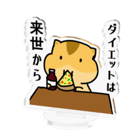 アクリルフィギュア - 50x50mm「ダイエットは来世から」という強い決意(?)を抱く、食いしん坊なハムスターの日常を切り取ったアクリルスタンドです。 美味しそうなピザを頬張り、コーラ(?)を片手に幸せそうな表情のハムスター。この姿は、きっと多くの人の心に響くはず…! ・デスクに、食卓に、カバンに! 見るたびに「まぁ、いっか!」と優しい気持ちになれる、癒やし系のアイテムです。 ・サイズ: 存在感のある50mm×50mm。どこに置いても目を引くデザインです。 ・仕様: 組み立て式のアクリルスタンド。台座もセットになっています。 ダイエット中の方へのユーモアあふれるプレゼントとしても最適です。「頑張りすぎなくて大丈夫だよ」というメッセージを込めて贈ってみませんか? 【商品仕様】 サイズ:50mm × 50mm 素材:アクリル 印刷:UVインクジェット印刷
