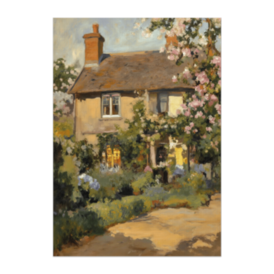 ポスター - B2この商品はpixivFACTORYで作られた商品です。サンプル画像は完成イメージのため、実物と異なる場合があります。 柔らかな夕陽に照らされた英国風コテージと、咲き誇る庭を描いた油絵風ポスターです。温かい光と優しい筆致が、まるで絵本の一場面のような穏やかな世界を演出します。お部屋のインテリアにもぴったりな癒しの一枚です。