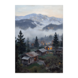 ポスター - B2この商品はpixivFACTORYで作られた商品です。サンプル画像は完成イメージのため、実物と異なる場合があります。 朝霧に包まれた山岳の小さな村を、静かな油絵風タッチで描いたポスターです。光る窓明かりと重なる山並みが、幻想的でどこか懐かしい雰囲気をつくり出します。落ち着いたインテリアにぴったりのアート作品です。