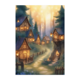 ポスター - B2この商品はpixivFACTORYで作られた商品です。サンプル画像は完成イメージのため、実物と異なる場合があります。 柔らかな夕光に包まれたミニチュア風の森の村を描いた癒しのポスターです。ランタンの灯り、小さな家々、温かい光の粒が漂う幻想的な雰囲気が魅力。眺めているだけで心が落ち着くような、優しいファンタジーアート作品です。