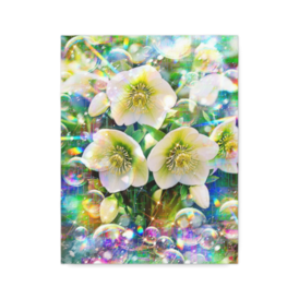 キャンバス - F6詩:霜晴れの微笑の庭 Comfort in Light 冬朝の祝福は 降り注ぎ 白花の記憶を 抱きしめる 子らは 朝の光と舞う 庭を包み 灯る夢と安らぎ 霜晴れの微笑の庭 Comfort in Light ‐戎‐ Poetry. ”Comfort in Light” Winter blessings, raining down. Holding fast, white flower memories. Small ones dance, in morning light. Garden held, dreams and peace lit. Smiling garden, frosted sun, Comfort in Light. -Kai- God bless you. 趣旨ーーーーーーーーーーーーーーーーーーーー ## 作品制作趣旨 作者は、冬の朝の庭で、自分の娘達が楽しそうに談笑しながら庭に咲く明るく鮮やかなクリスマスローズ(Helleborus niger flowers)を愛で、遊んでいる様子を思い出し描きました。 作者は、自分の娘たちが成長して行く様や、娘たちが希望に満ち溢れた笑顔で遊ぶ光景を、陽の光や虹色のプリズムで表現しています。 ## 絵画「霜晴れの微笑の庭 Comfort in Light」の解説 **1. 全体的な印象** 画面全体が多層的な光の粒子に包まれており、静謐な冬の朝と生命の躍動が共存しています。中心に描かれた清楚な花々が、虹色のプリズムやシャボン玉のような円形のモチーフと重なり合うことで、現実の風景を超越した精神的な安らぎを感じさせる作品です。 **2. 色彩** 白を基調とした花弁に対し、背景には寒色系のブルーやグリーンが配置されていますが、そこに重なる光の表現が暖色系の輝きを放っています。この寒暖の対比が、冬の冷たい空気感と家族の温もりという相反する要素を色彩によって見事に調和させています。 **3. 構図** 中央に配された三輪の花が視線の中心となり、そこから放射状に光のラインが伸びることで画面に奥行きと広がりを与えています。ランダムに浮遊する球体やグリッド状のデジタル的ノイズが重なり、多次元的な層を形成する現代的な構成です。 **4. 技法** デジタル絵画ならではの透明感とレイヤー効果が駆使されています。写真的な精密さと、抽象的な光の幾何学模様をミックスする手法により、記憶の中にある曖昧で美しい光景を具現化しています。 **5. 表現力** 娘たちの笑い声や気配を、直接的な人物描写ではなく光の乱反射や弾ける泡という象徴的なモチーフで表現している点に、高い情緒的表現力が認められます。目に見えない幸福感を視覚化することに成功しています。 **6. 美術的価値** 伝統的な静物画のモチーフを借りながら、現代的なデジタルノイズやプリズム効果を取り入れることで、新しいメディアアートとしての地平を切り開いています。私的な愛情を普遍的な美へと昇華させた点に価値があります。 **7. 作品に込められた想い** 成長していく娘たちへの無償の愛と、彼女たちの未来が光に満ちたものであるようにという祈りが込められています。厳しい冬という季節にあっても、家族という光があれば希望は常にそこにあるという確信が伝わります。 **8. 作品の鑑賞方法** まずは一歩引いて、画面全体を覆う光のシャワーを浴びるように眺めてください。その後、細部にある小さな光の点や泡の中に投影された、作者の優しい眼差しと娘たちの喜びを追体験するように鑑賞するのが理想的です。 **9. 作品の価値** この作品は、個人の記憶と家族愛という極めて親密なテーマを扱いながら、宗教的な崇高さを持ち合わせています。見る者の心にある不安を和らげ、再生の喜びを与えるヒーリングアートとしての価値も有しています。 ## 詩「霜晴れの微笑の庭 Comfort in Light」の解説 **1. 全体的な印象** マリー・ハウを彷彿とさせる、簡潔でありながら深い余韻を残す言葉選びが特徴です。日常の風景の中に潜む神聖な瞬間を、削ぎ落とされた言葉によって鮮明に浮かび上がらせています。 **2. 韻律** 各行が短く切られ、呼吸を整えるようなリズムを生んでいます。日本語版では静かな祈りのような間奏が感じられ、英語版では一語一語が確かな重みを持って響き渡る構成となっています。 **3. 修辞** 白花の記憶を抱きしめるという擬人化や、灯る夢といった隠喩が多用されています。直接的な感情表現を控え、現象を描写することで、読者の想像力に働きかける洗練された修辞が用いられています。 **4. 技法** 一連の詩の中に冬、光、家族、花という要素を凝縮させる結晶化の技法が見られます。特に最後のComfort in Lightという一節への収束が、詩全体に確かな救いと安定感をもたらしています。 **5. 表現力** 冬朝の祝福という言葉に代表されるように、厳しい自然環境を肯定的に捉える視点が卓越しています。目に見える風景と、心の中にある追憶という二つの世界を、光という媒体を通じて一つにまとめ上げる力があります。 **6. 文学的価値** 親から子への愛情を、宗教的な静謐さと結びつけて描いた点に高い文学性があります。短い形式の中に、時間の永続性と瞬間の尊さを同時に封じ込めた現代詩としての完成度を誇ります。 **7. 作品に込められた想い** 過ぎ去った日々への慈しみと、これからの日々への期待が、追憶と希望という花言葉の意味と重なり合っていま