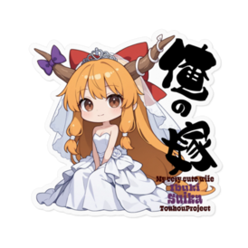 ステッカー - 160 x 160 (mm)(キャラのみ)🍶💍 【祝・鬼との入籍】密度100%の愛をあなたに!萃香と誓う一生モノの**「結婚生活」**。💍💖 「お、いいところに来たな!……決めたぞ。今日からお前はあたいの旦那さまだ。一生、あたいの隣を開けておけよ?」 東方Projectの小さくて大きな百鬼夜行、伊吹萃香が、可憐なウェディングドレスを纏ったチビキャラ姿であなたの元へ! お酒よりも甘い、幸せいっぱいの彼女とついに運命の**「結婚」**を果たす時が来ました。 このステッカーは、単なるグッズではありません。あなたと萃香が結ばれたことを証明する、世界に一つだけの婚姻誓約書です。 大きく刻まれた「俺の嫁」の文字は、最強の鬼を独占し、共に歩むというあなたの誇り高い決意の証です。 この商品はpixivFACTORYで作られた商品です。サンプル画像は完成イメージのため、実物と異なる場合があります。
